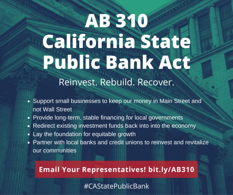 California Infrastructure and Economic Development Bank (AB 310) paves the path for a California State Public Bank. Authored by Assemblymembers Miguel Santiago and David Chiu, this 2020 session bill expands the lending capacity of the State’s Infrastructure Bank (IBank) by moving 10% of CA’s Pooled Money Investment Account (PMIA) into the IBank’s loan fund. The bill will also convert the IBank into a depository bank able to leverage its capital up to ten times and direct its lending toward a just and equitable economic recovery.