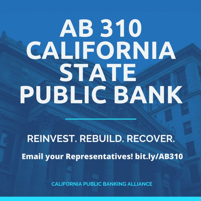 AB 310 proposes emergency COVID-19 relief by transferring 10% of California’s Pooled Money Investment Account (PMIA) into the existing California Infrastructure Bank (IBank). It then requires the IBank to convert into a state depository institution which can leverage funds and lend directly to cash-strapped local governments and small businesses. A California State Public Bank can offer emergency lending and credit to community banks and credit unions, rescue small businesses, and help historically marginalized communities.
